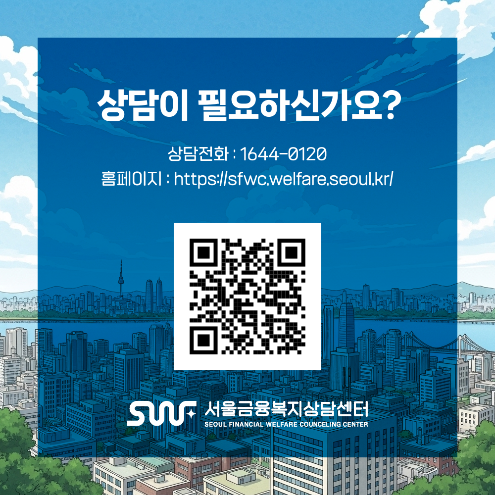 서울금융복지상담센터는 시민들의 금융문제를 해결하고, 가계 부채로 인한 고통을 줄이기 위해 설립된 서울시 공공기관입니다. 채무조정, 금융교육, 청년 재무상담 등 다양한 지원 프로그램을 운영하며, 시민이 ‘경제적 자립’을 이루도록 돕는 든든한 동반자 역할을 합니다.