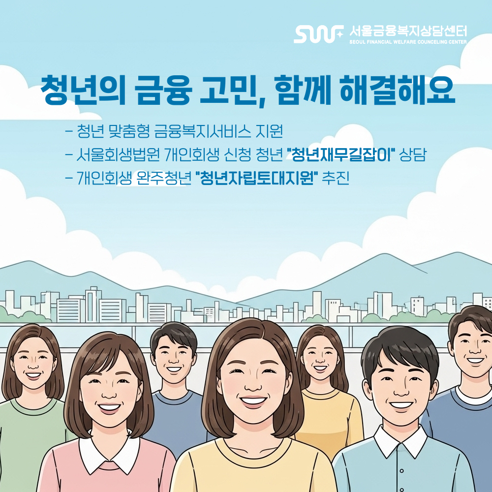 서울금융복지상담센터는 금융 위기로부터 시민을 보호하고, 다시 일어설 수 있는 기반을 제공합니다. 혼자 고민하지 마세요. 지금 바로 상담을 통해 문제를 해결하고, 더 나은 내일을 준비하세요.