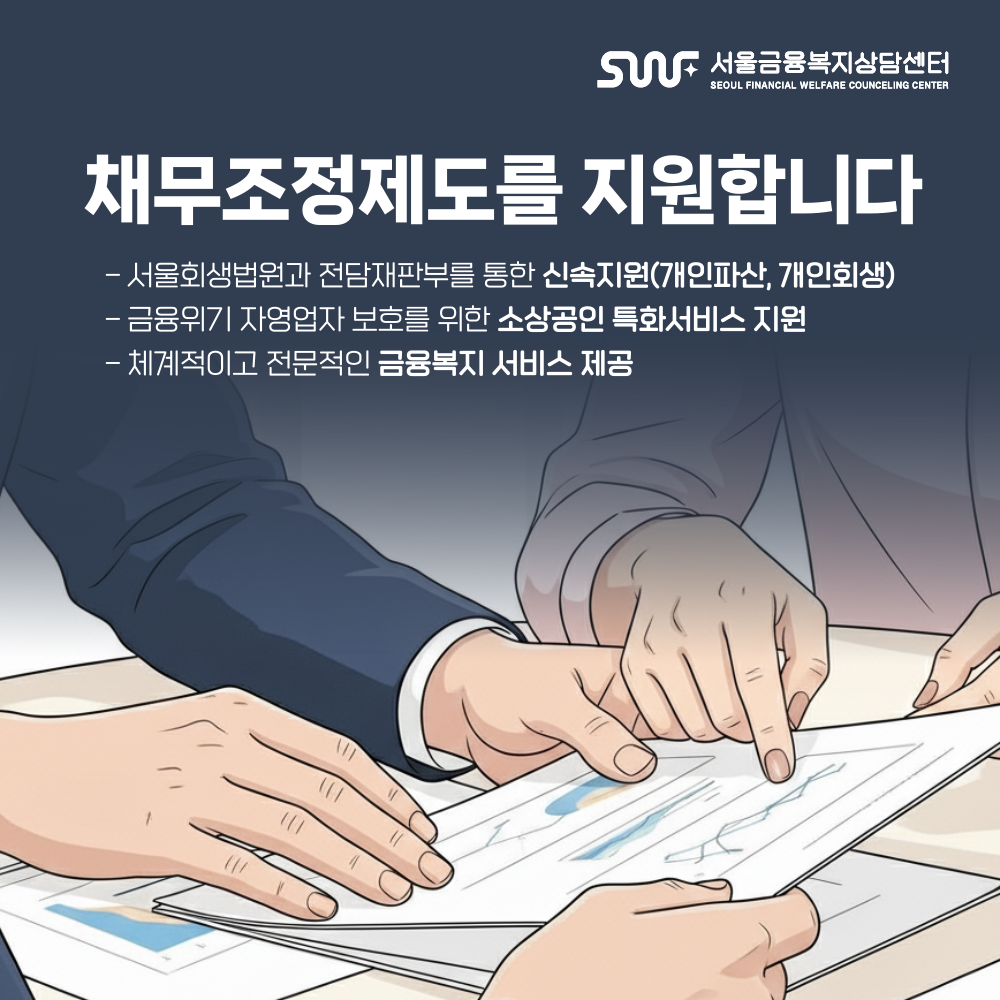 서울금융복지상담센터의 핵심 서비스는 바로 ‘채무조정제 지원’입니다. 개인회생, 파산, 신속한 재판부 지원 등 전문적인 절차를 통해 과도한 빚 부담을 덜어줍니다. 특히 서울회생법원과의 협업을 통해 신속하고 투명한 절차가 진행되며, 자영업자와 소상공인 대상의 특화 프로그램도 운영되고 있습니다.