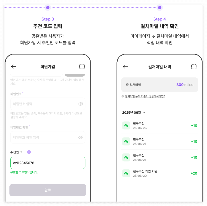 ‘친구 추천’은 추천인 코드를 공유하여 받은 사용자가 이용하면 컬처마일이 적립되는 기능입니다.