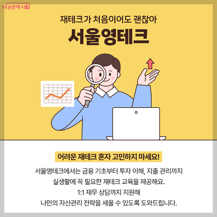 서울시는 '서울영테크'라는 청년 맞춤형 재테크 교육 프로그램을 통해 금융 기초 교육, 1:1 재무 상담, 지출·투자 관리 전략 까지