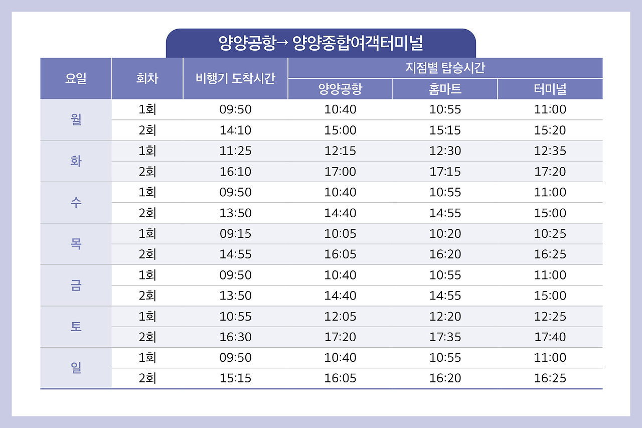 - 항공기 도착 후 1시간 10분 후 양양종합터미널로 출발