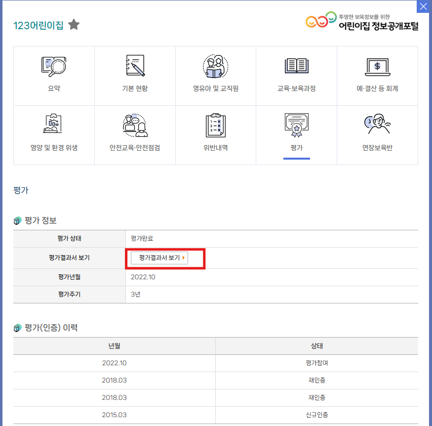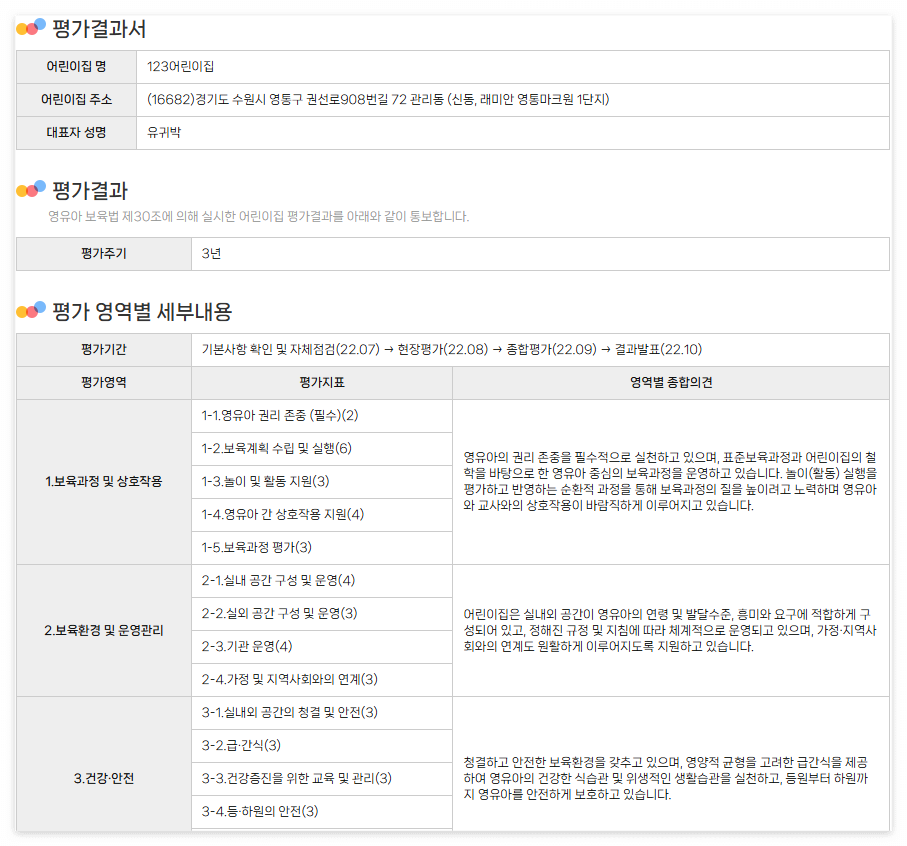 - 평가 결과: 한국보육진흥원의 정기적인 평가 등급 및 결과