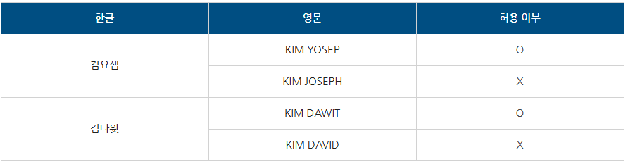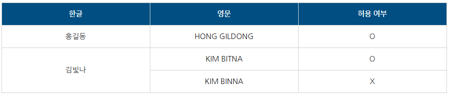 | 한글성명의 발음으로 명백하게 일치하지 않는 경우 | 증빙자료 제출 시 정정 가능 (예시) 홍길동 : HONG GILDONE → HONG GILDONG |