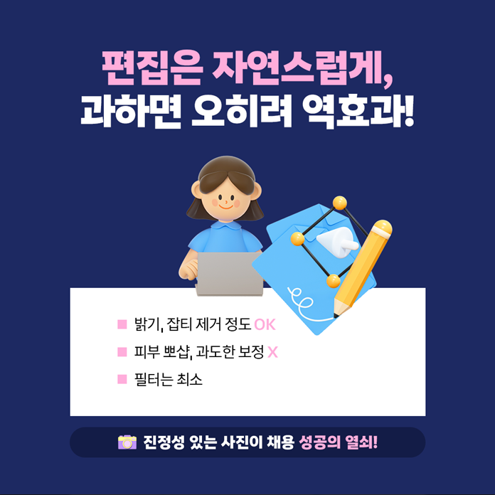 복장, 표정, 배경, 편집까지 세심하게 신경 쓴 사진 한 장이 취업 성공의 첫 관문을 통과하게 만들어 줄 수 있습니다.