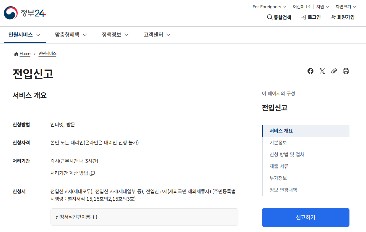 이사 후 14일 이내에 주민센터 방문 또는 정부24(www.gov.kr)를 통해 온라인으로 전입신고를 할 수 있습니다. 신고인은 세대주여야 하며, 지연될 경우 불이익이 발생할 수 있으니 반드시 기한을 지켜야 합니다.