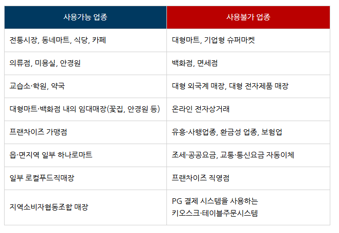 지역사랑상품권 | 지자체 앱 | 가맹점 내 사용 가능 |
