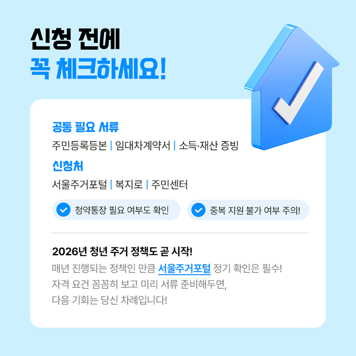 서울주거포털, 복지로, 주민센터를 통해 신청 가능합니다. 공통적으로 주민등록등본, 임대차 계약서, 소득 및 재산 증빙 자료가 필요하며, 일부 정책은 청약통장 가입 및 부모와 별도 거주가 필수 요건입니다. 2026년 이후의 구체적인 공고 일정은 국토교통부 또는 각 지자체 사이트에서 확인하세요.