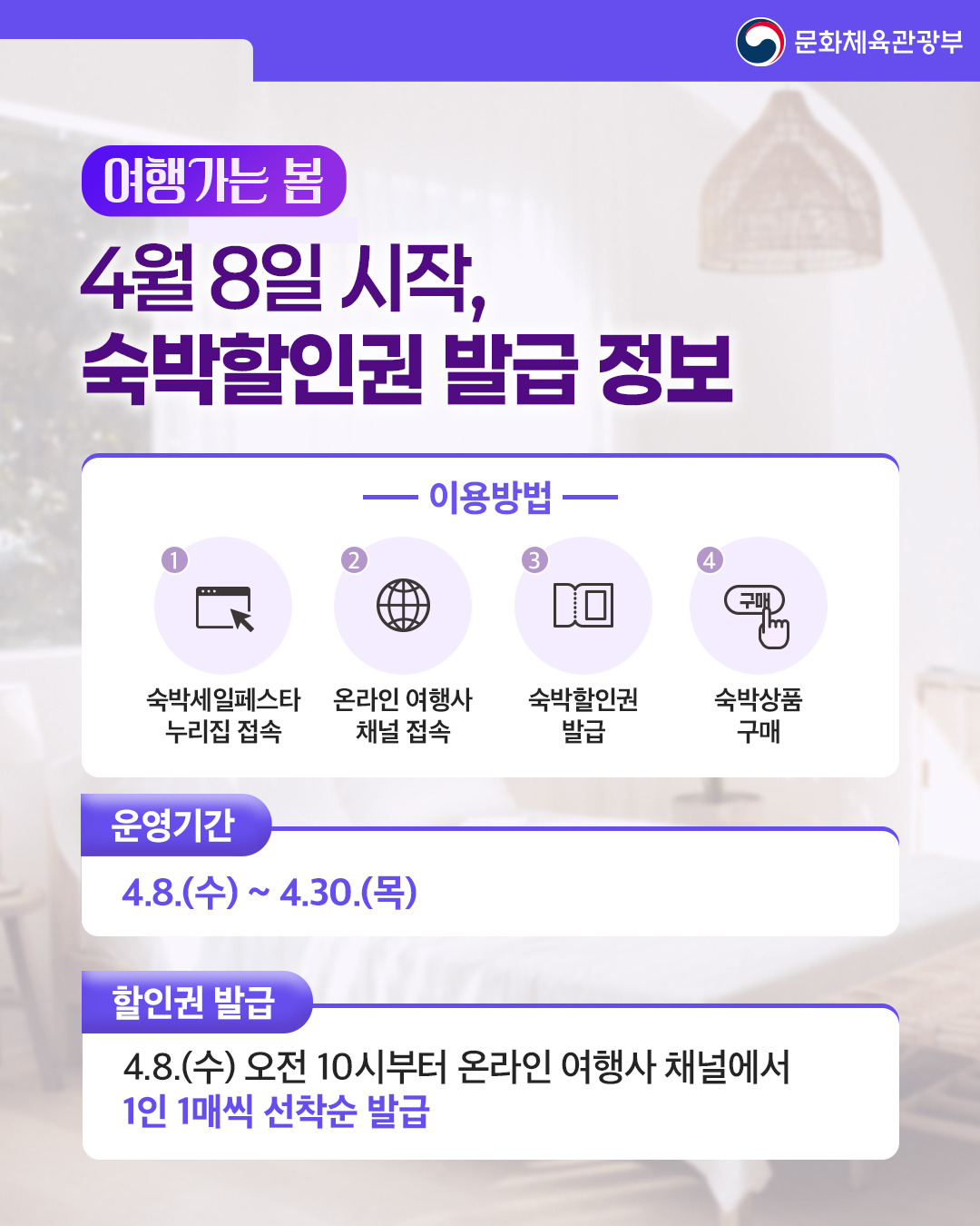 - 할인권 발급: 4월 8일(수) 오전 10시부터 온라인 여행사 채널에서 1인 1매씩 선착순 발급