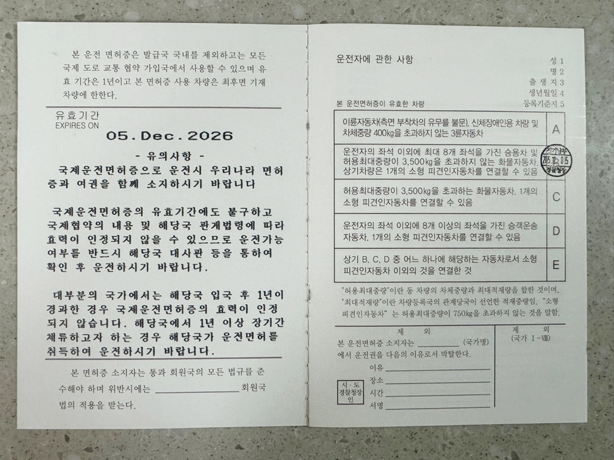 | 형태 | 별도의 종이 책자형 | 기존 면허증 뒷면에 영문 인쇄 |