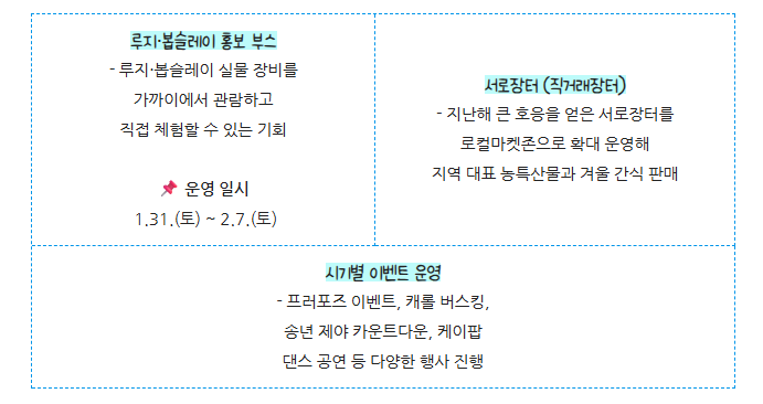 이번 시즌에는 단순한 스케이팅을 넘어 다양한 겨울 체험이 마련됩니다. 루지·봅슬레이 홍보 부스에서는 실제 장비를 가까이서 보고 체험할 수 있으며, ‘서로장터’에서는 지역 농특산물과 겨울 간식을 판매하는 로컬마켓존이 열립니다. 또한 프러포즈 이벤트, 캐롤 버스킹, 제야 카운트다운, 케이팝 댄스 공연 등 다채로운 공연이 이어져 데이트 코스나 가족 나들이 장소로도 제격입니다.