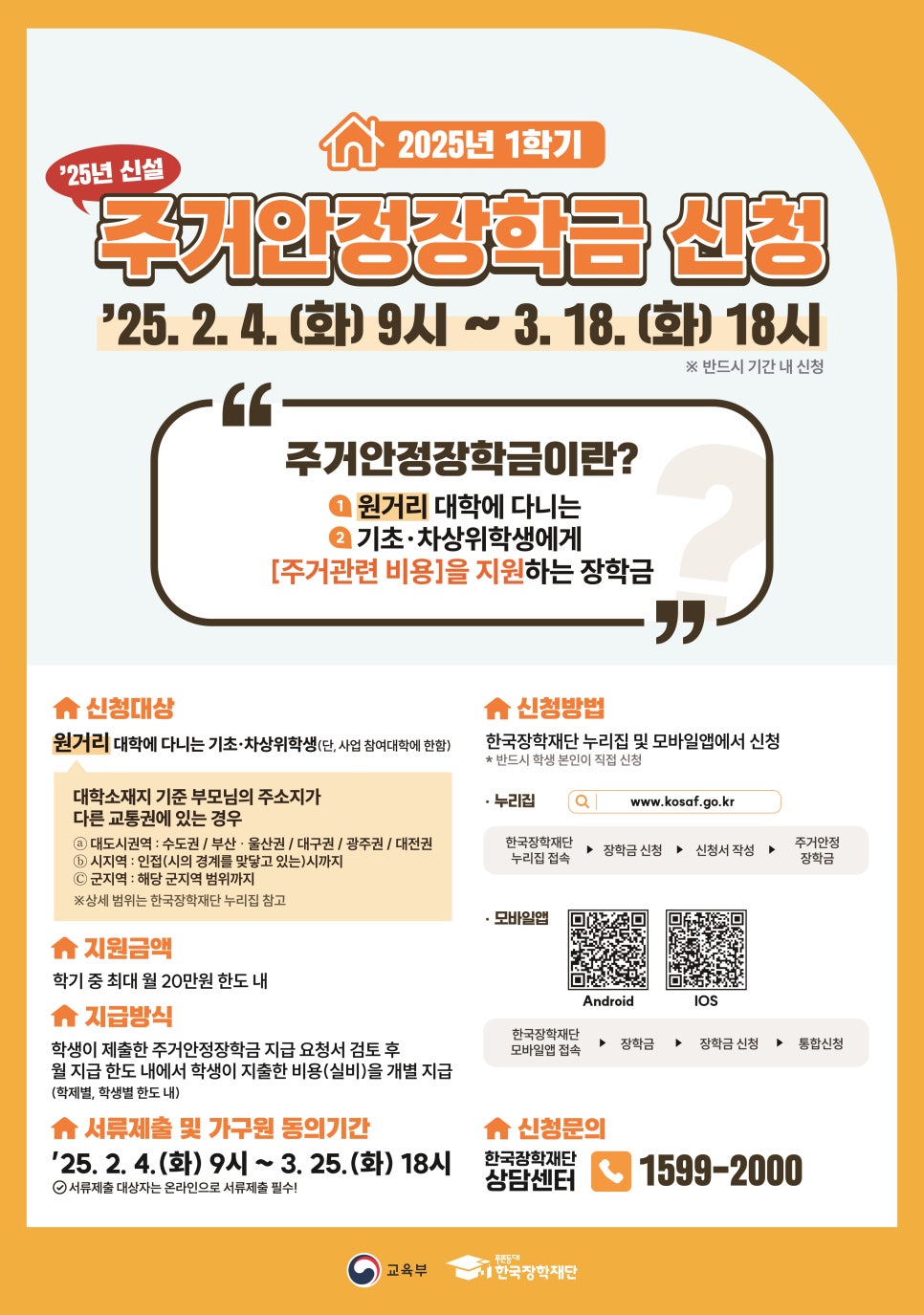 원거리 대학에 다니는 저소득층 대학생의 주거비 부담을 덜어주기 위한 지원금인 2025학년도 1학기 주거안정장학금 신청이