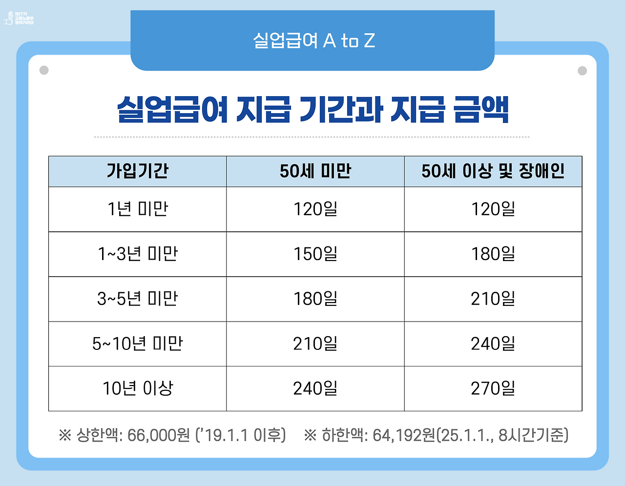 | 가입기간 1년 미만 | 120일 | 평균임금의 60% |
