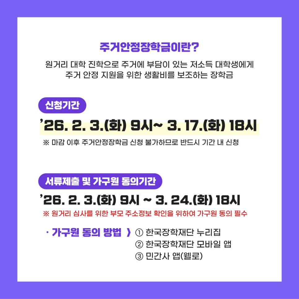 2026년 1학기 기준으로 지원이 필요한 대학생들에게 주거 안정의 기틀을 마련해 주기 위한 취지로 운영되고 있습니다. 따라서 본인이 지원 대상에 해당한다면 주저 말고 신청하여 경제적 자유를 조금이라도 더 누리시길 바랍니다.