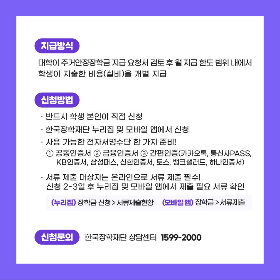 - 지급 방식: 대학이 학생의 주거안정장학금 지급 요청서를 검토한 뒤, 월 지급 한도 범위 내에서 학생이 실제 지출한 비용을 실비로 개별 지급합니다.