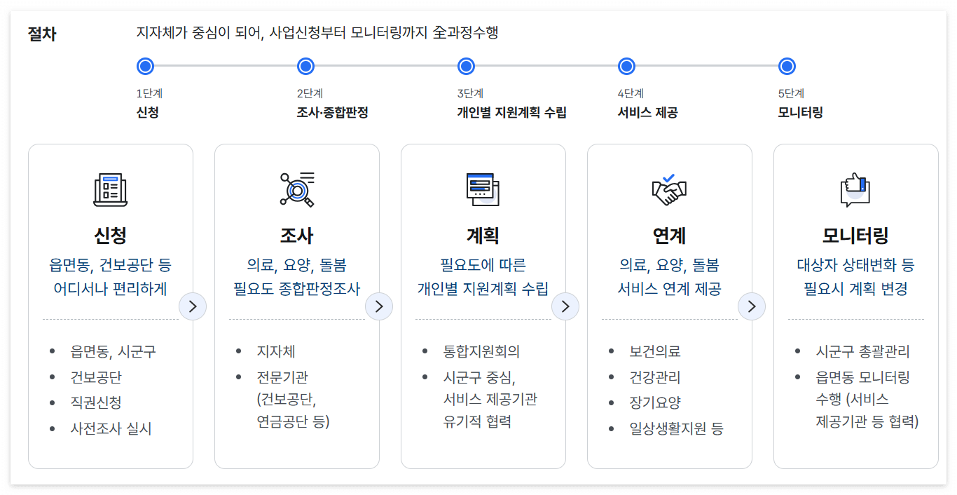 - 통합 지원: 보건의료, 건강관리, 장기요양, 일상돌봄을 패키지로 제공합니다.