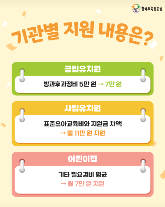 공립유치원은 방과후 과정비가 5만 원에서 7만 원으로 확대되며, 사립유치원은 표준유아교육비와의 차액이 월 11만 원 지원됩니다. 어린이집은 기타 필요경비 평균으로 월 7만 원이 지원됩니다.