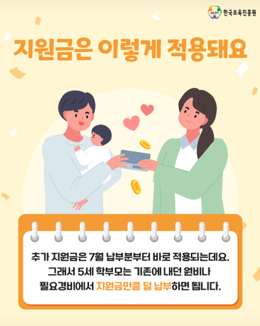 추가 지원금은 2025년 7월 납부분부터 바로 적용됩니다. 따라서 학부모들은 기존에 납부하던 원비나 필요경비에서 지원금만큼 줄어든 금액을 납부하면 됩니다.