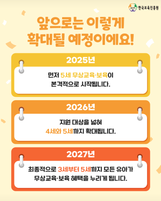 2025년에는 5세부터 무상교육·보육이 시작되고, 2026년에는 4세까지 확대됩니다. 2027년에는 3세부터 5세까지 모든 유아가 무상교육·보육 혜택을 받게 될 예정입니다.
